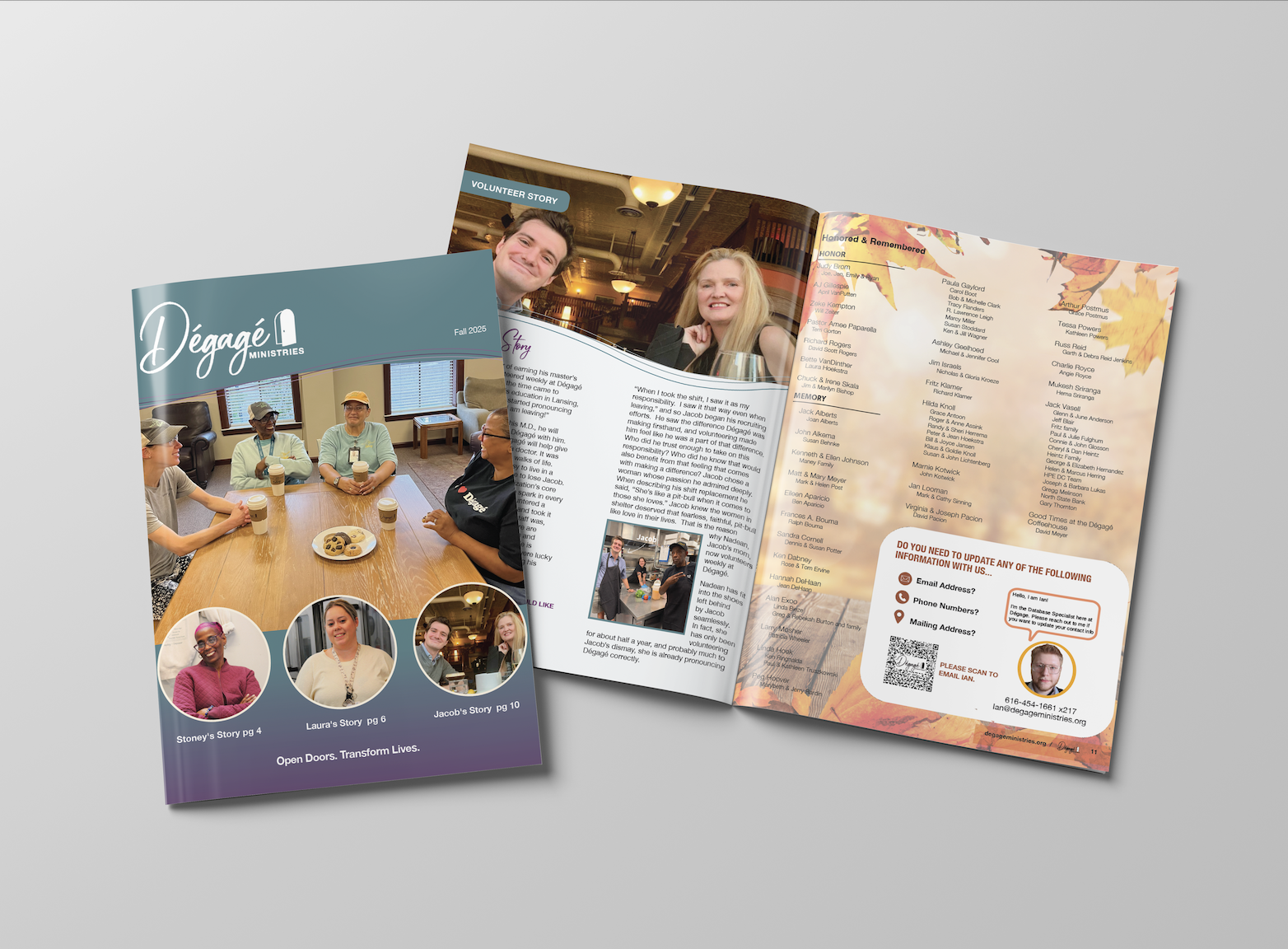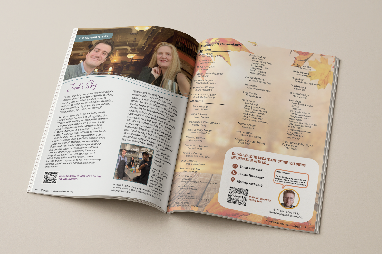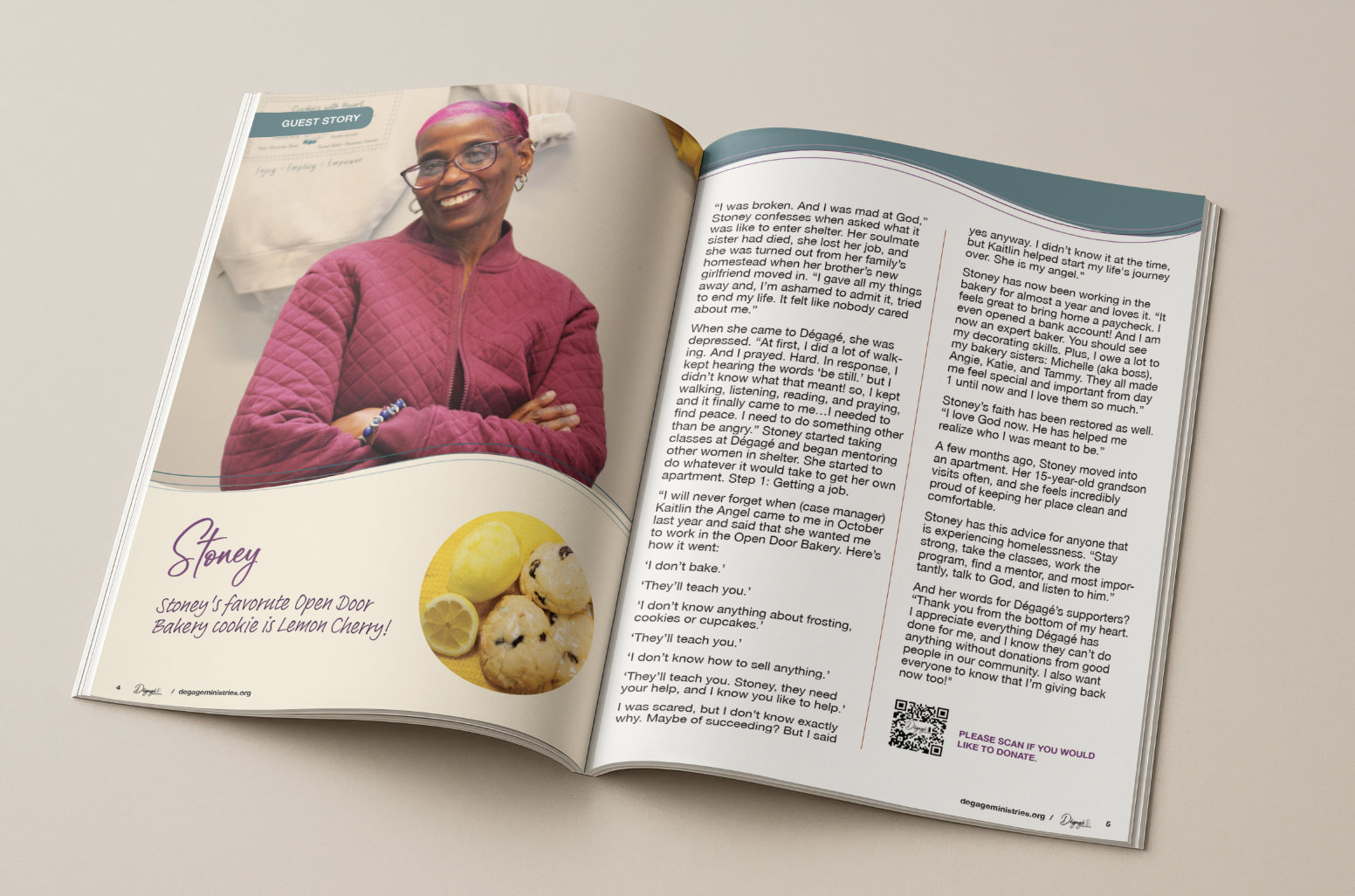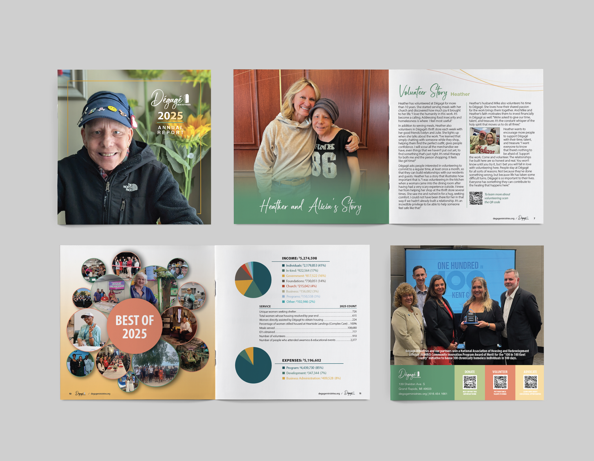 I was tasked to design the annual report that goes out every year through the mail. I took full lead on this project, designing each page, the envelope, and the remit. The annual report is intended to be mailed to donors and supporters in hopes of gaining more support for Dégagé and celebrating the accomplishments in the past year. It tells stories from the shelter that include volunteers, staff, and patrons.